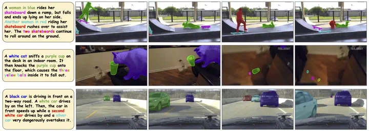 TeaserRecent advances in multimodal large language models (MLLMs) have expanded research in video understanding, primarily focusing on high-level tasks such as video captioning and question-answering. Meanwhile, a smaller body of work addresses dense, pixel-precise segmentation tasks, which typically involve category-guided or referral-based object segmentation. Although both research directions are essential for developing models with human-level video comprehension, they have largely evolved separately, with distinct benchmarks and architectures. This paper aims to unify these efforts by introducing \ourDataset{}, a new dataset containing thousands of challenging videos, each annotated with detailed, human-written captions and temporally consistent, pixel-accurate masks for multiple objects with phrase grounding. Our benchmark evaluates models on both holistic/high-level understanding and language-guided, pixel-precise segmentation. We also present carefully validated evaluation measures and propose an effective model architecture that can tackle our benchmark.